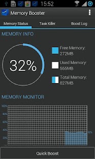 Memory Booster provides a live chart to demonstrate your device’s total/free memory and current memory usage.